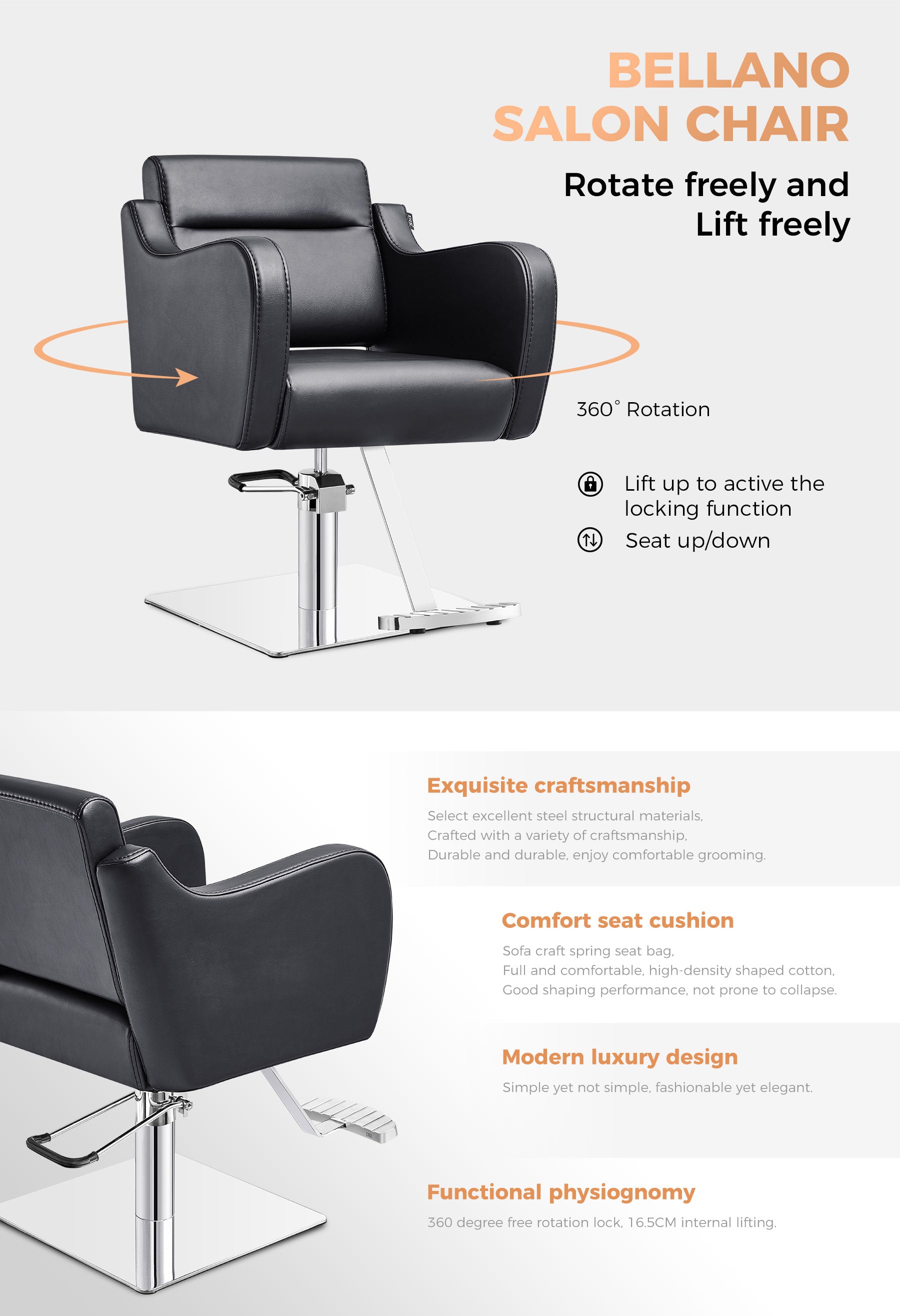 ما يُميّز كرسي صالون بيلانو هو تصميمه المريح. فهو يوفر إمكانية تعديل الارتفاع، مما يسمح لمصففي الشعر بالعمل براحة تامة بغض النظر عن طولهم. هذه الميزة لا تُحسّن وضعية الجلوس فحسب، بل تضمن أيضًا جلوس العملاء على الارتفاع الأمثل أثناء جلسات العلاج. ونتيجةً لذلك، يشعر كل من مصففي الشعر والعملاء بمزيد من الاسترخاء والراحة خلال وجودهم في الصالون.