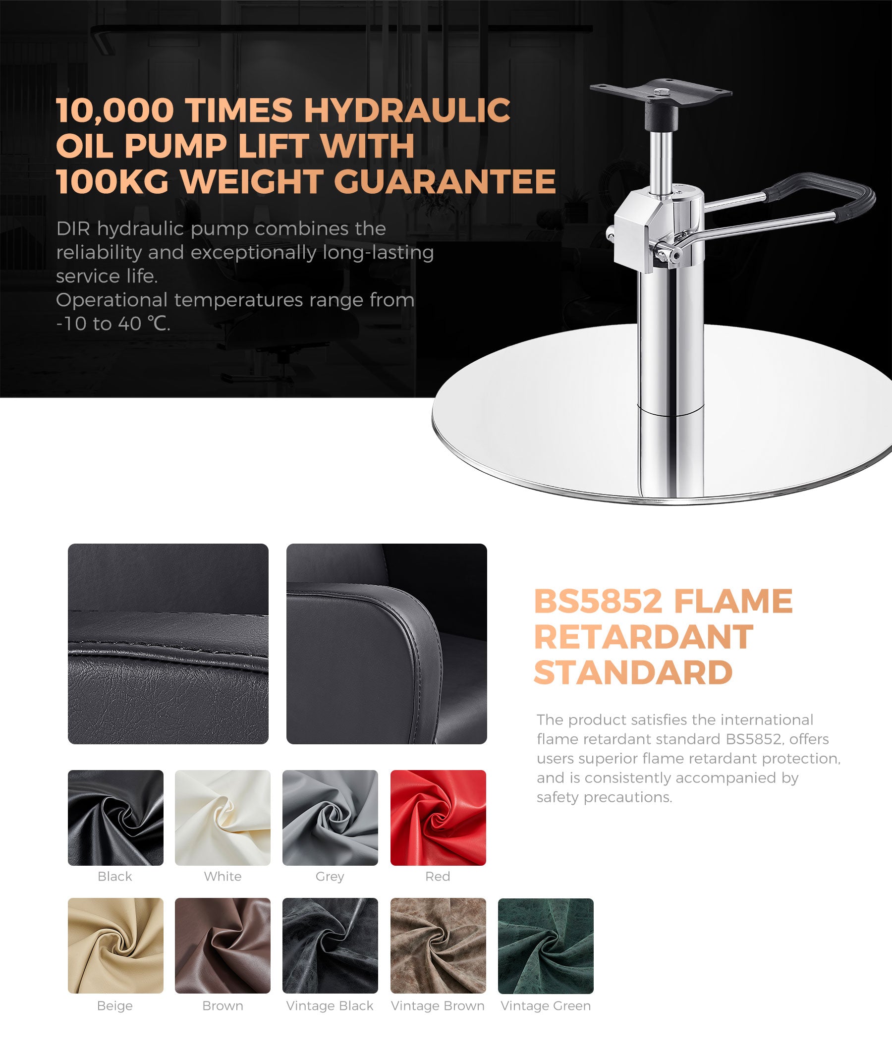صُمم كرسي صالون بيلانو ليتحمل متطلبات صالونات التجميل المزدحمة، فهو يتميز بمتانته وطول عمره. تستطيع المضخة الهيدروليكية شديدة التحمل التعامل مع أوزان تزيد عن 204 كيلوغرامات، مما يضمن بقاء الكرسي متيناً وموثوقاً. يأتي الكرسي مع ضمان لمدة عامين على المضخة وثلاث سنوات على القاعدة، مما يعزز من متانته.