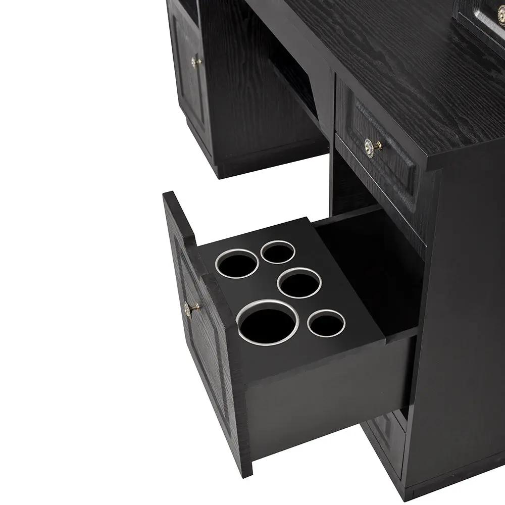 Werten Sie Ihren Arbeitsbereich mit der Barberstation Britainnica III auf und erleben Sie den Komfort und das stilvolle Design, das sie Ihrem Friseursalon verleiht. Beeindrucken Sie Ihre Kunden mit ihrem eleganten Design, dem großzügigen Stauraum und den praktischen Funktionen. Schluss mit überfüllten Arbeitsflächen und unordentlichen Werkzeugen – mit dieser Barberstation hat alles seinen Platz und ist leicht zugänglich.