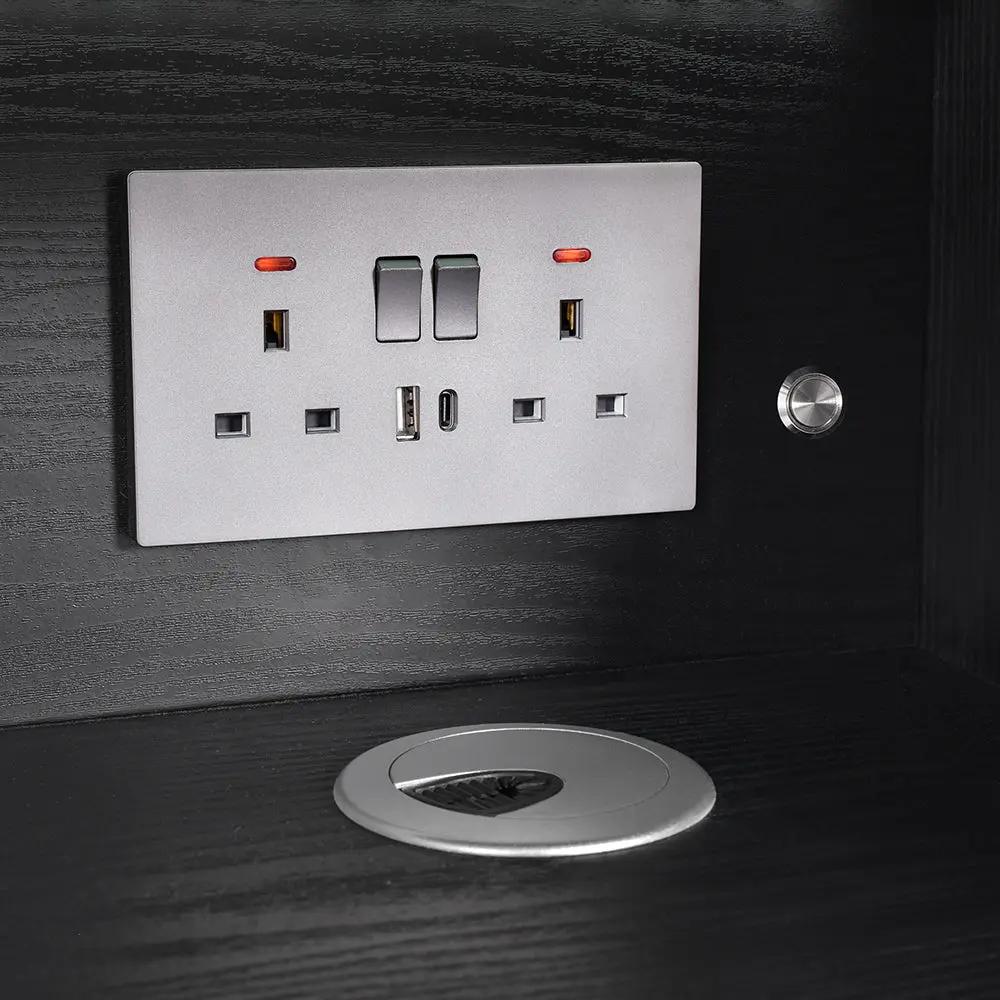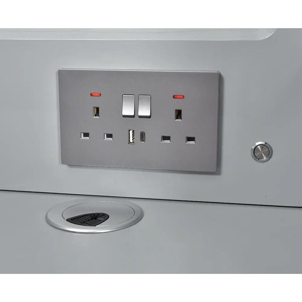 Doch die Funktionalität hört hier nicht auf. Steckdosen mit Typ-C- und USB-Anschlüssen ermöglichen es Ihren Kunden, alle elektrischen Geräte bequem aufzuladen. Dieser Friseurplatz verfügt außerdem über einen Wandspiegel, der eine klare und scharfe Reflexion liefert und Ihnen so jedes Mal den perfekten Schnitt und das perfekte Styling ermöglicht. Der Spiegel ist optimal in Höhe und Winkel positioniert, sodass Sie Ihre Arbeit stets im Blick haben und präzise Korrekturen mühelos vornehmen können.