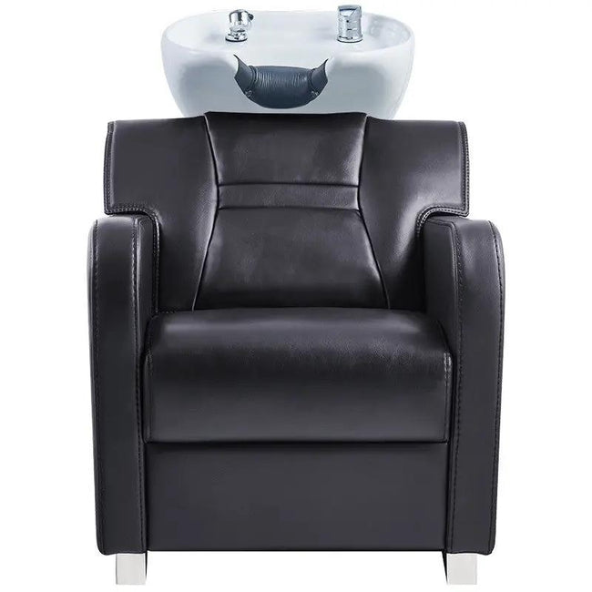 The chair is accompanied by a tilting ceramic sink in either black or white, further adding to its practicality and functionality. The reinforced solid steel frame supports both the chair and the basin, ensuring a secure and stable setup. This allows you to provide top-notch salon services without any worries about the equipment's durability.