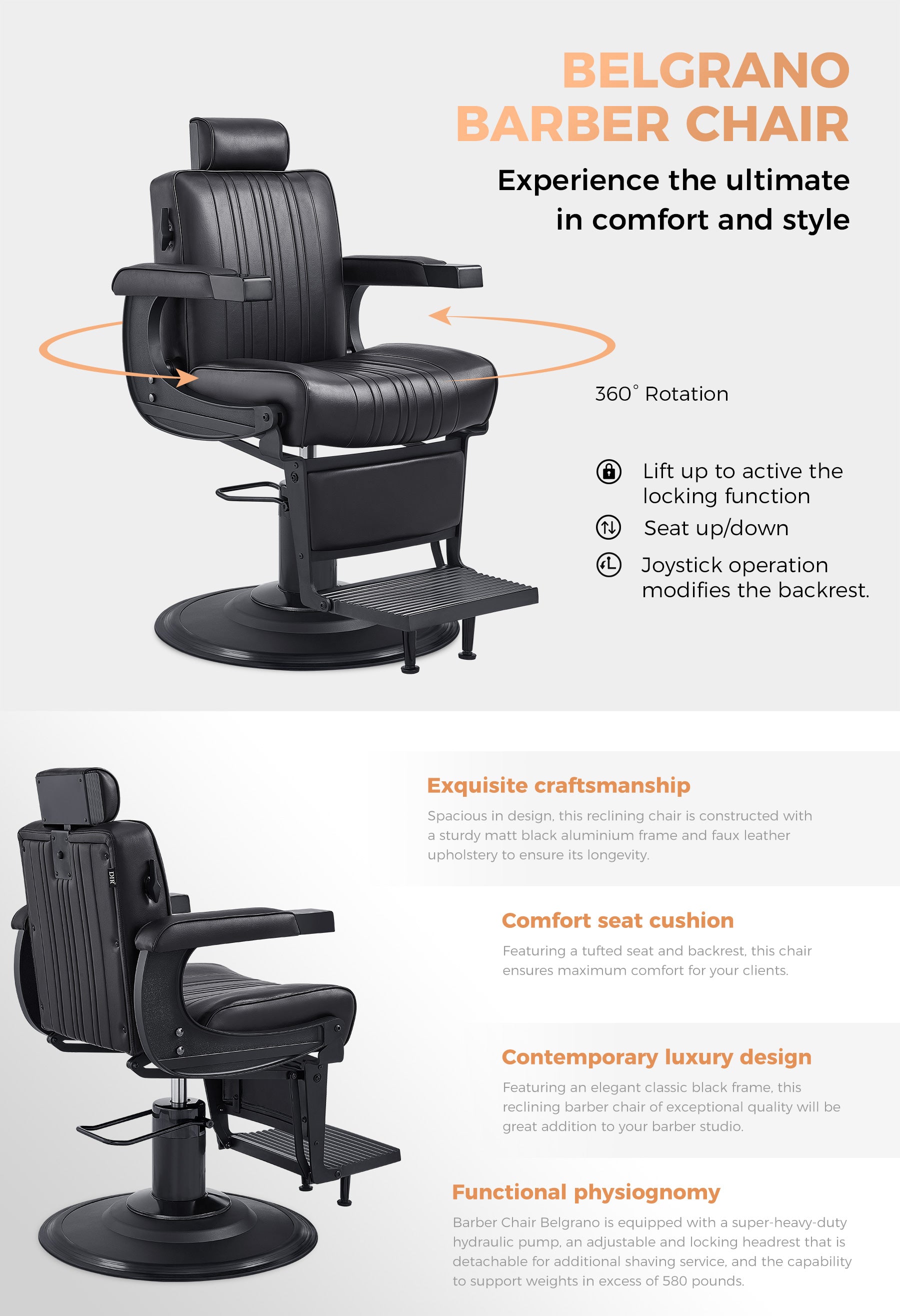 DIR:n Belgrano-parturituoli on klassinen ja tyylikäs tuoli, joka on suunniteltu ammattimaisilla ominaisuuksilla ja sopii täydellisesti mihin tahansa kampaamoon tai parturiliikkeeseen. Erittäin tehokkaan hydraulipumpun, säädettävän niskatuen ja mukavan pehmusteen ansiosta tämä tuoli on täydellinen lisä parturi- ja kampaamotarvikkeisi arsenaaliin.