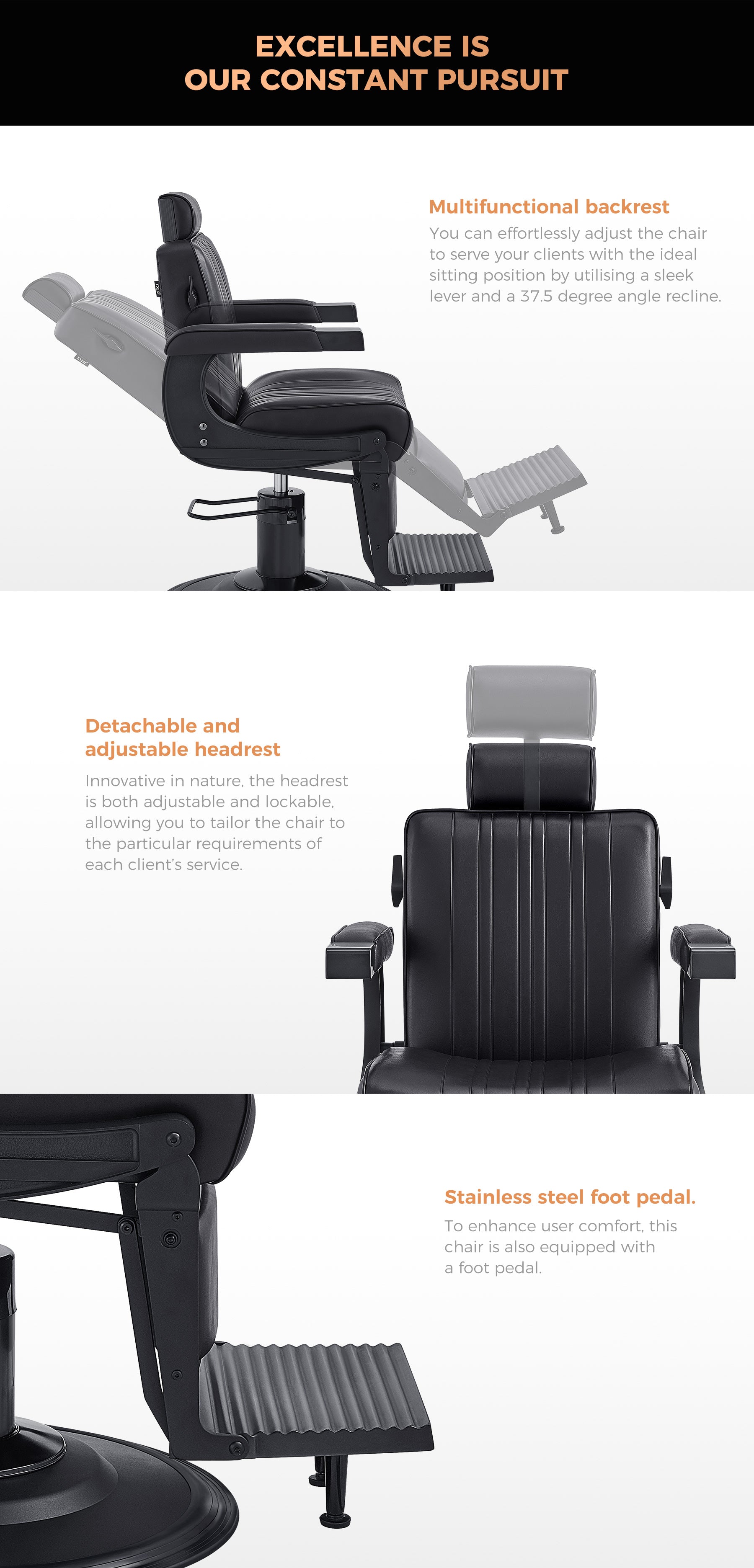 Tämän parturituolin säädettävä selkänoja tarjoaa asiakkaillesi optimaalisen mukavuuden. Olivatpa he mieluummin pystyasennossa tai makuuasennossa, tämä tuoli mukautuu helposti heidän tarpeisiinsa. Tämän ominaisuuden ansiosta pääset myös helposti käsiksi asiakkaasi hiusten eri alueille, mikä tehostaa trimmausprosessiasi.