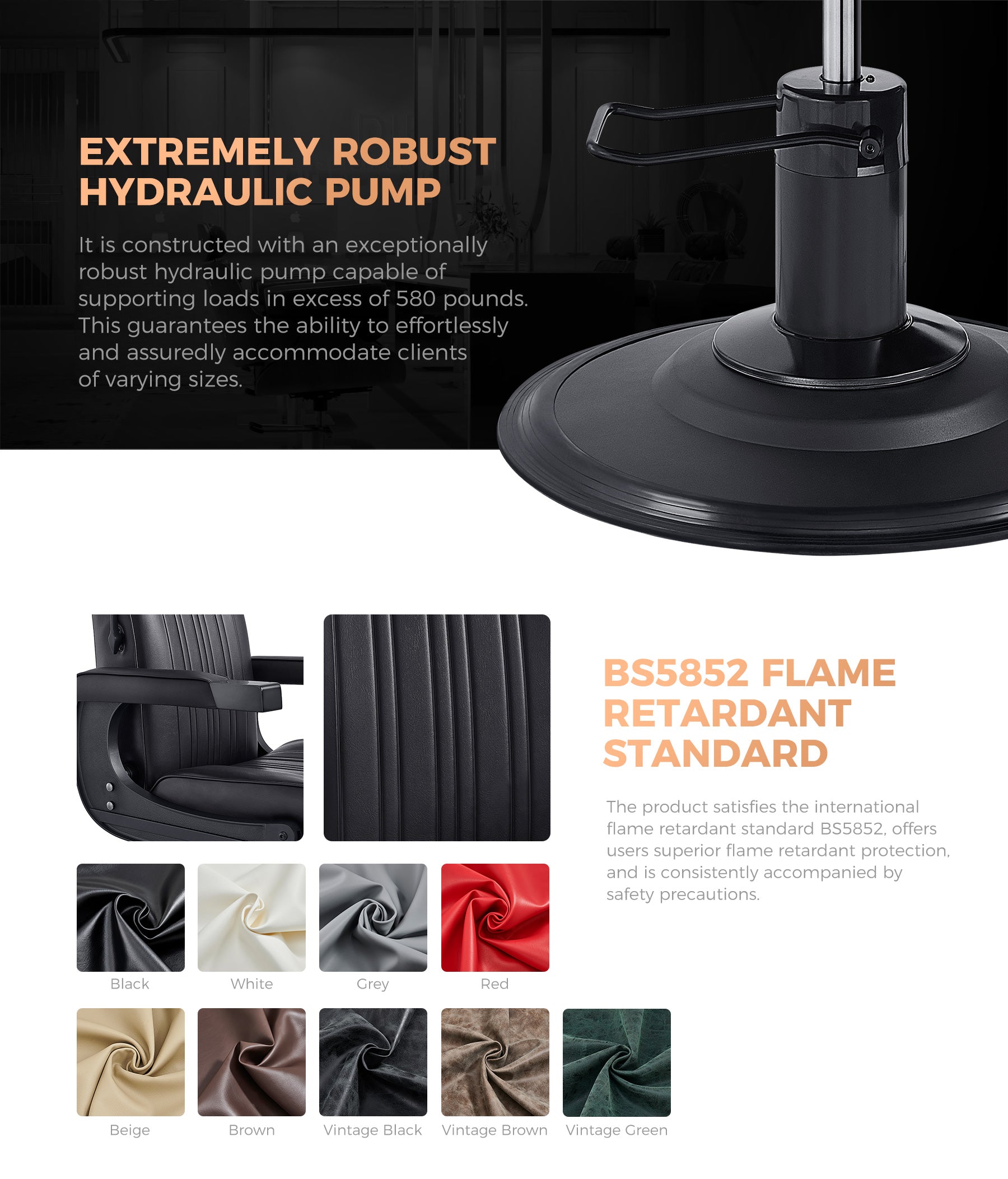 Mukavan istuimen lisäksi tässä modernissa parturituolissa on erittäin tehokas hydraulinen pumppu. Tämä pumppu on suunniteltu käsittelemään jopa vaikuttavan 230 kg:n painoja, mikä varmistaa, että tuoli sopii kaikenkokoisille asiakkaille. Hydraulipumppu mahdollistaa myös helpon korkeussäädön lukitustoiminnolla, joten löydät täydellisen asennon asiakkaillesi.