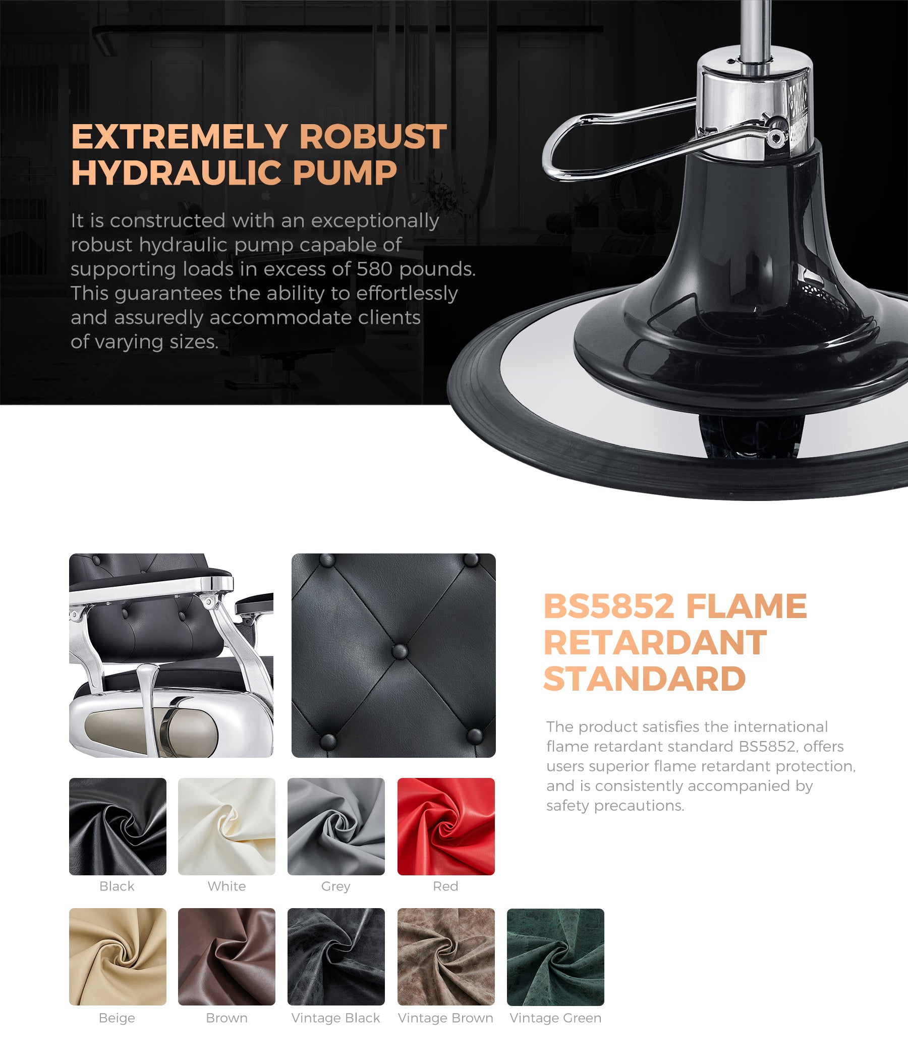 Mukavuus ei ole ainoa asia, jossa Barber Chair Titan loistaa – se tarjoaa myös poikkeuksellisen säädettävyyden. Tuoli kallistuu jopa 45 asteen kulmaan tyylikkään vivun avulla, jolloin asiakkaasi löytävät haluamansa asennon vaivattomasti. Erittäin tehokas hydraulinen pumppu ja jalusta tukevat jopa 200 kg:n painon, joten se sopii kaikenkokoisille asiakkaille.
