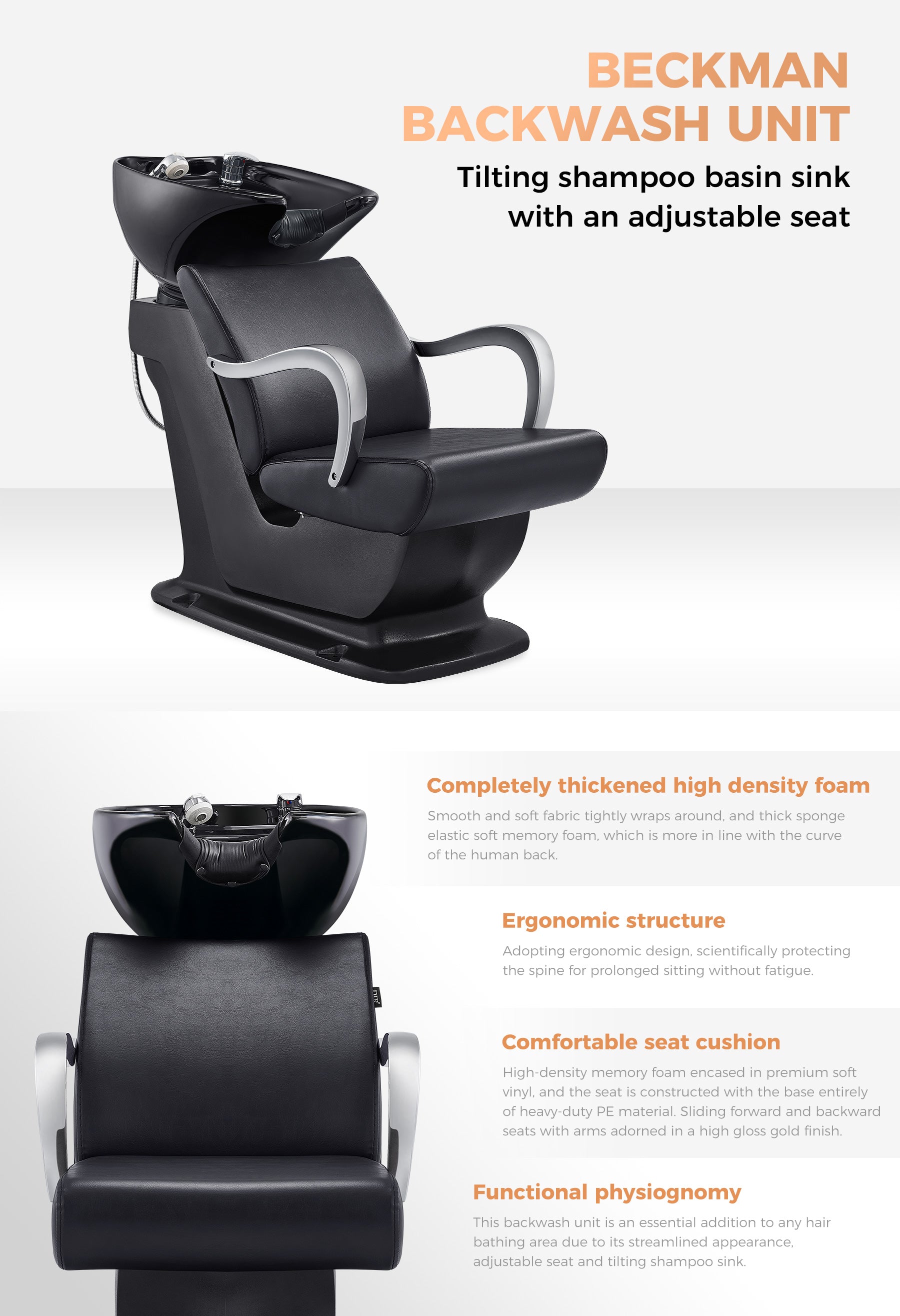 Beckmanin vastavirtapesulaite on suunniteltu joustavuutta ajatellen. Siinä on säädettävä allas, jonka avulla stylistit voivat sijoittaa altaan yksittäisten asiakkaiden tarpeiden mukaan. Tämä varmistaa mukavan ja räätälöidyn kokemuksen hiustenpesun aikana. Säädettävä istuin parantaa tätä mukavuutta entisestään ja sopii erilaisille vartalotyypeille ja mieltymyksille. Näin asiakkaat voivat rentoutua nauttien palvelusta ja luoda miellyttävän tunnelman kampaamollesi.