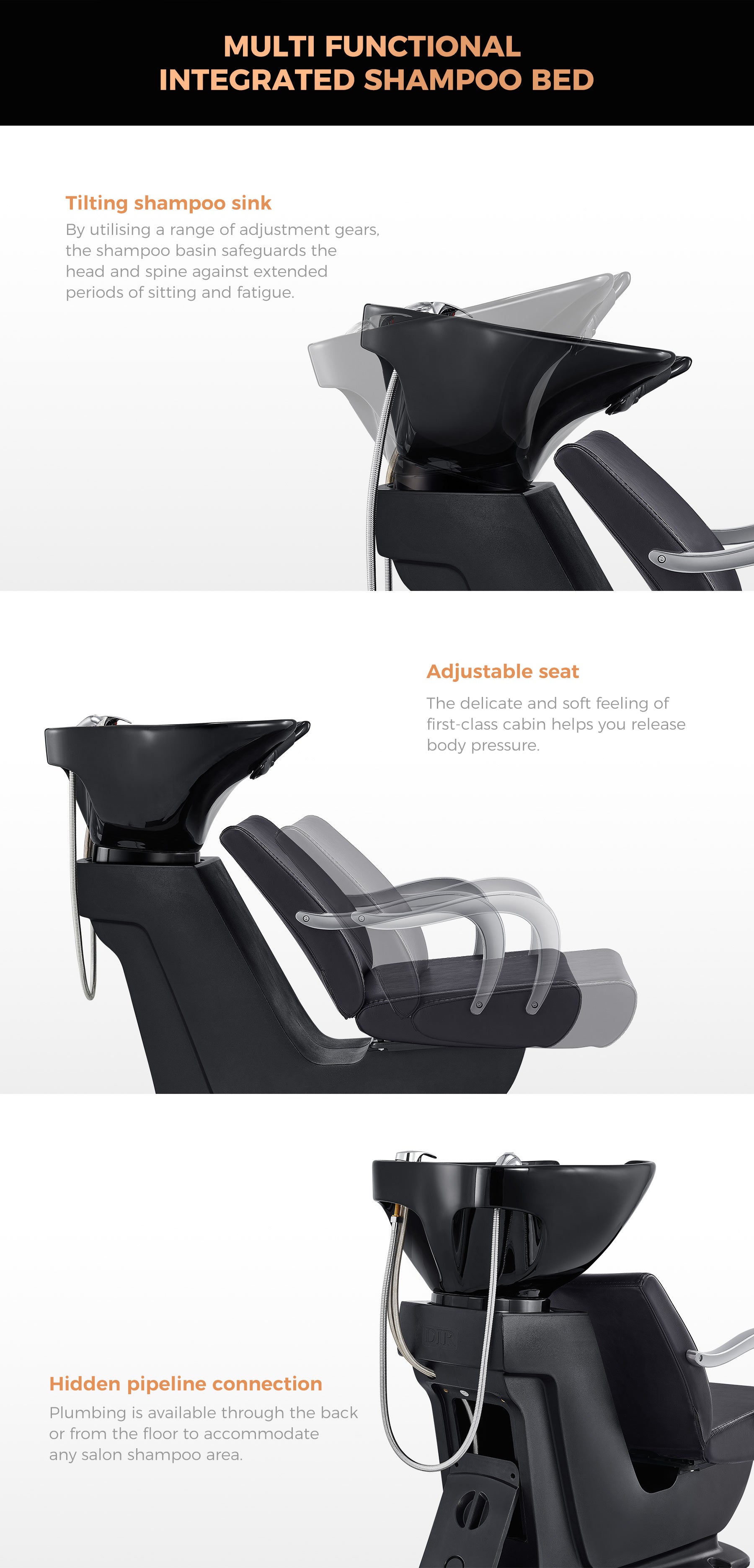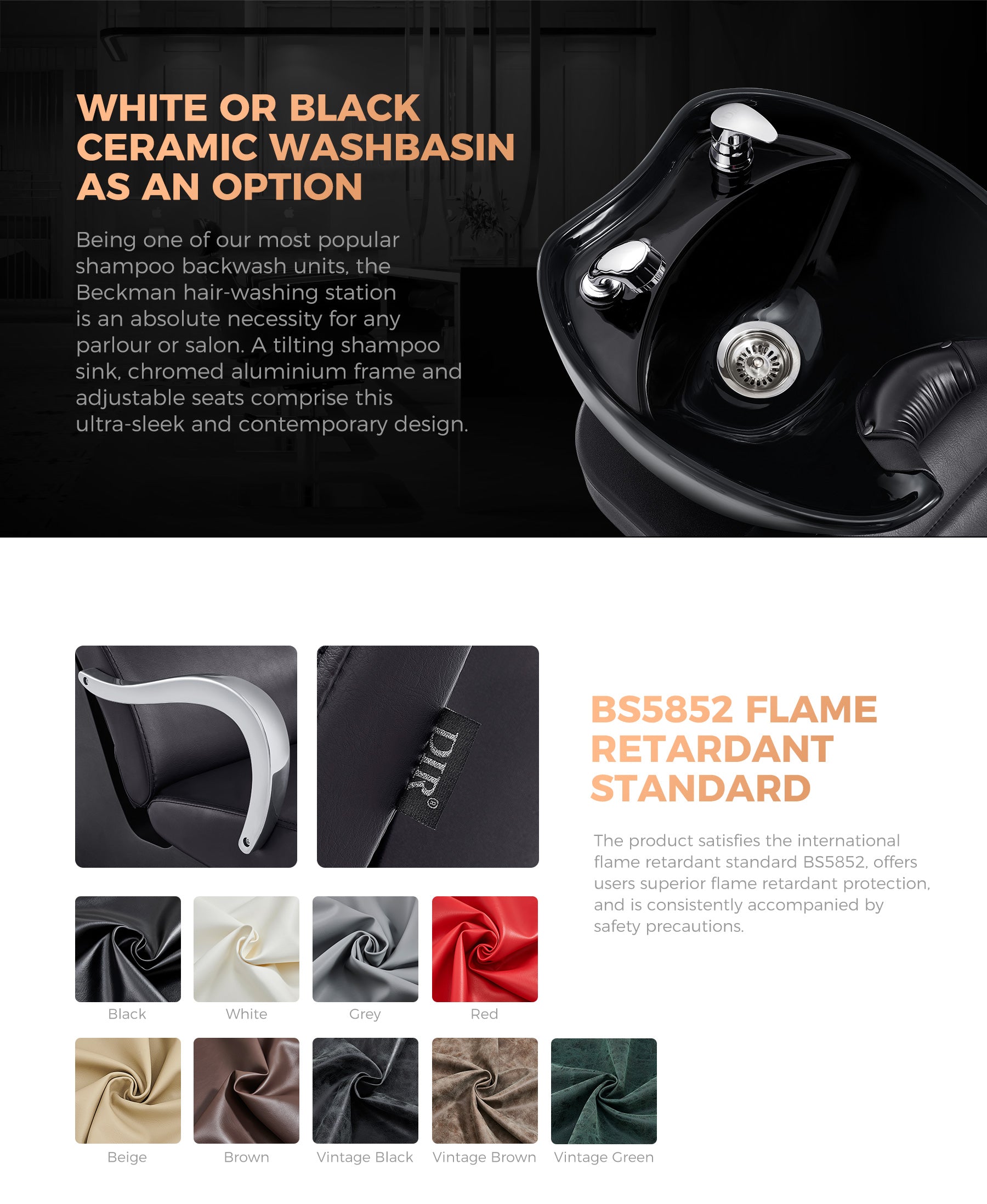 Tuolissa on myös kallistuva shampooallas, joka voidaan säätää täydelliseen asentoon jokaiselle asiakkaalle. Tämä ei ainoastaan lisää henkilökunnan käyttömukavuutta, vaan varmistaa myös, että asiakkaasi voivat asettua mukavasti hiustenpesun aikana. Keraaminen allas on saatavana mustana tai valkoisena, joten voit valita vaihtoehdon, joka sopii parhaiten salonkisi estetiikkaan.