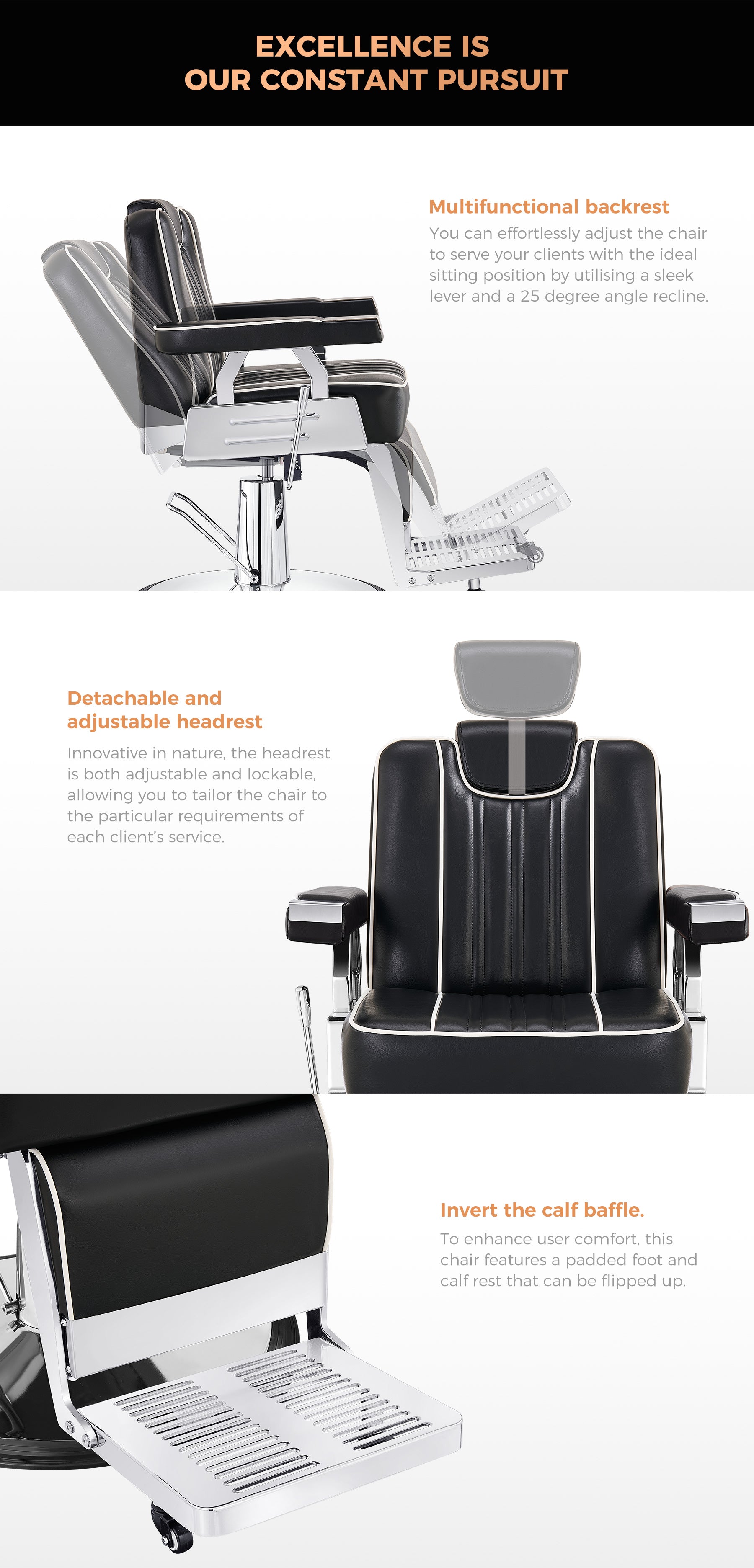 Az állítható funkciók mellett a DIR Majesty borbélyszék dönthető funkcióval is rendelkezik, amely lehetővé teszi ügyfelei számára, hogy kényelmes, 45-55 fokos szögben dőljenek hátra. Ez tökéletes a tiszta és klasszikus borotválkozáshoz, vagy egyszerűen csak ahhoz, hogy ügyfelei ellazuljanak a fodrászati élményük során.