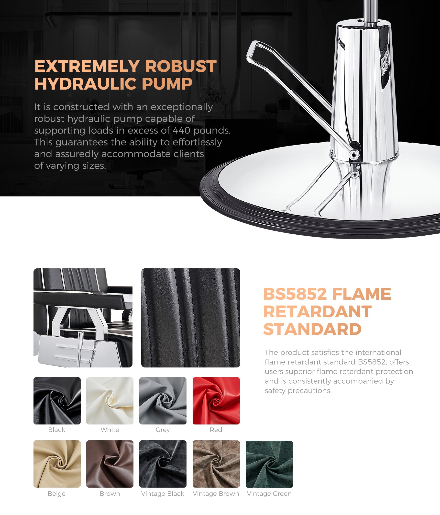 A Majesty x3 fodrászszék nagy teherbírású hidraulikus pumpával is fel van szerelve, amely akár 200 kg-os súlyt is képes kezelni. Ez a nagy teljesítményű pumpa biztosítja a sima és könnyed magasságállítást, lehetővé téve, hogy ügyfeleit könnyedén a kívánt magasságba helyezze. A szék beépített reteszelő mechanizmussal is rendelkezik, amely lehetővé teszi, hogy biztonságosan rögzítse bármilyen helyzetben a nagyobb biztonság és stabilitás érdekében.