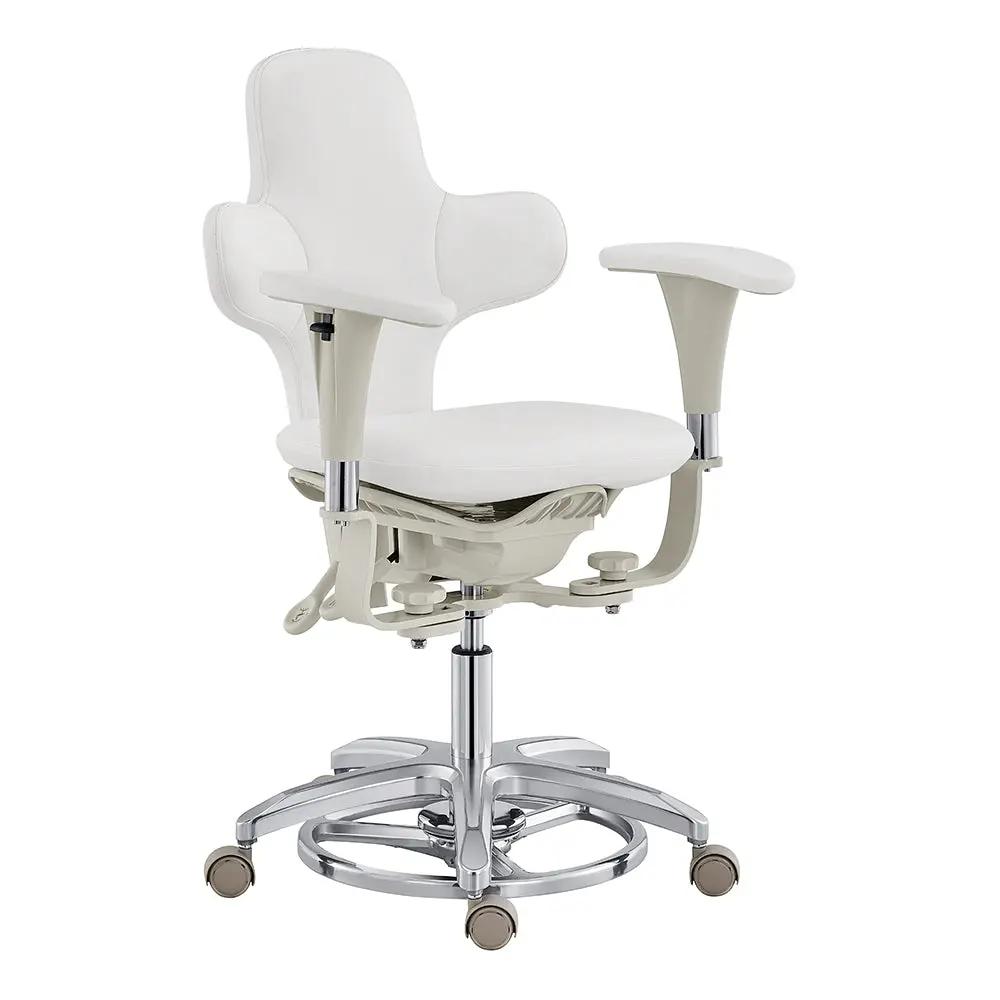 The revolutionary Hazel beauty stool incorporates substantial improvements in every facet and is comprised of design elements derived from our most functional beauty stool models. For additional stability, this modern beauty stool is equipped with six wheels that are securely attached to a wide base. The seat features a wide range of height adjustment and the three-point weight support cushion with air gap technology to suit any sitting position perfectly . The area beneath the high-density memory foam accommodates any body shape perfectly and offers additional comfort for extended sitting positions. Furthermore, to assist with back weight support, the extra-contoured backrest is equipped with forward-adjustable features, in addition to height-adjustment capabilities. An adjustable-height rotating armrest is situated on each side of the stool as an accessory. It permits rotation of the physician with respect to the armrest throughout the procedure.