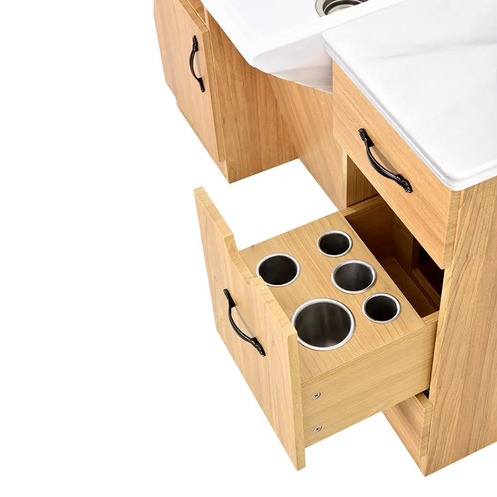 The Barber Unit is designed with efficiency in mind. It features a spacious layout that accommodates all the necessary tools for your barbering tasks. With a convenient frontwash sink, you can easily manage hair washing and cutting in one seamless area. This multifunctional design ensures that barbers can work quickly and effectively, so you can serve more clients while maintaining high-quality service.