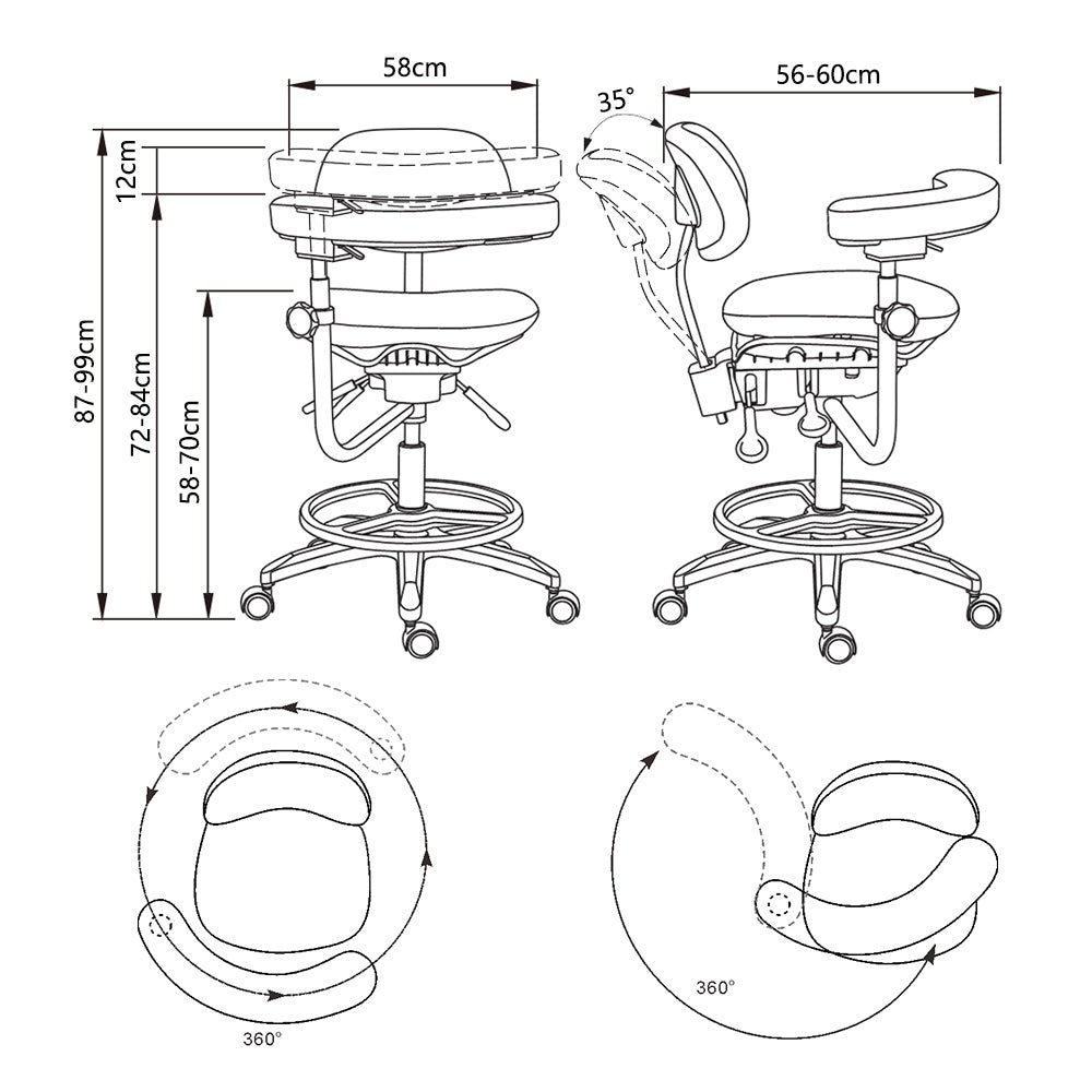 The revolutionary Willow beauty stool derives its design elements from our most functional stool models and incorporates significant enhancements in all areas. This contemporary stool features six wheels affixed to a broad base for optimal stability. The seat features a wide range of foot control gas lift height adjustment and three-point weight support. The space beneath the high density memory foam provides additional comfort for extended sitting positions and fits any body shape perfectly. In addition to having height-adjustment capabilities, the backrest is also forward-adjustable. The stool is complemented by a height-adjustable rotating armrest that can be positioned on either the left or right side. It provides the physician with the ability to rotate on the armrest during the service.