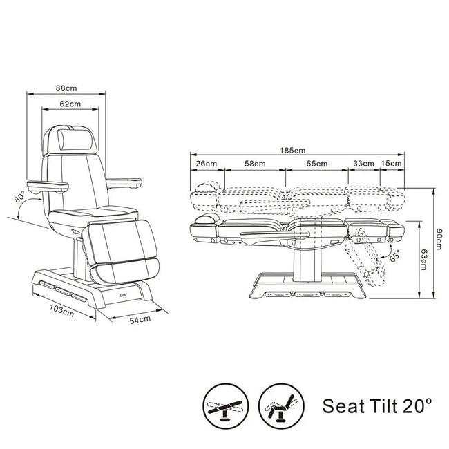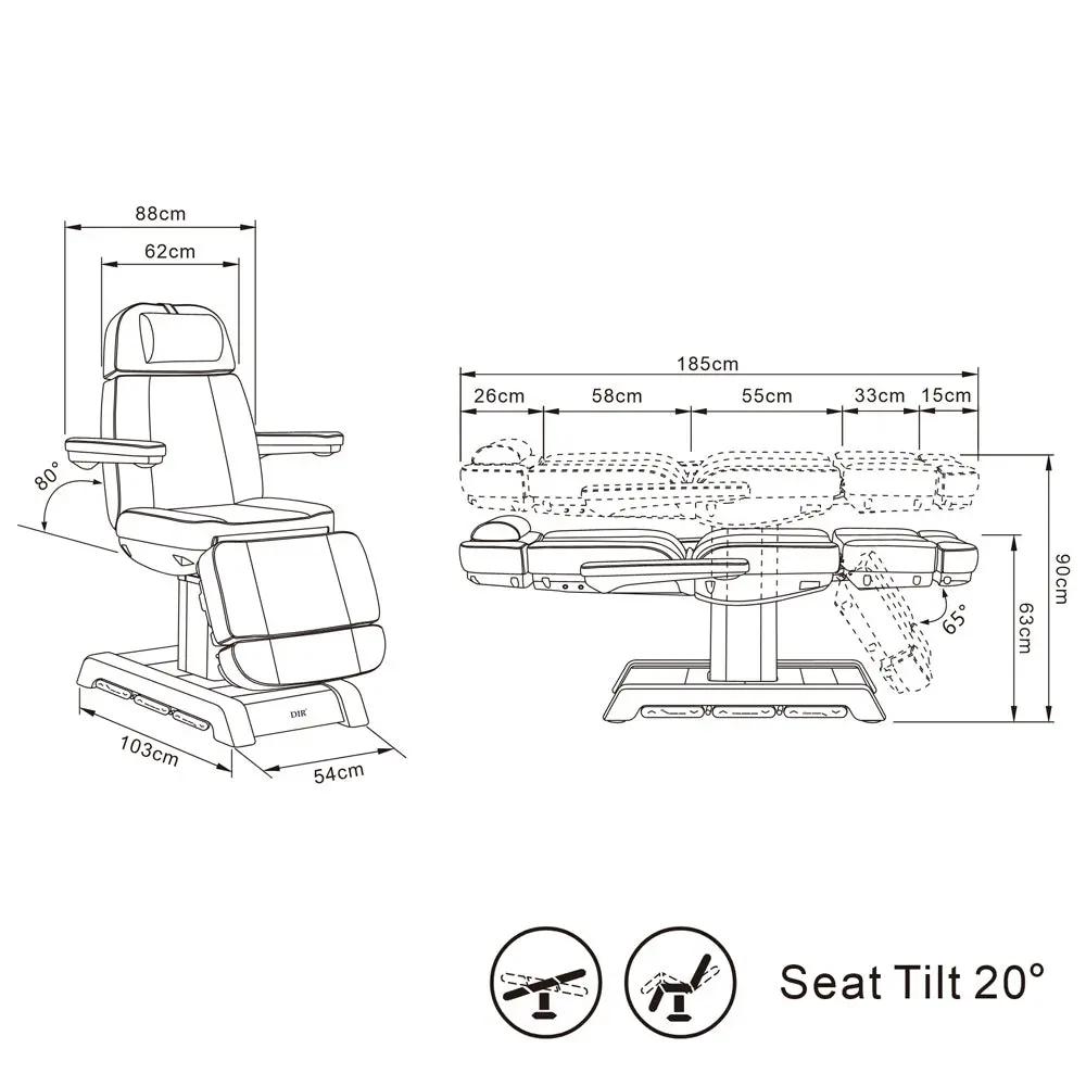 The Sydney beauty bed and treatment bed represents the apex of furniture technology. This professional spa treatment chair incorporates high end craftsmanship and precision engineering to handle every manner of beauty bed, treatment bed, or facial and cosmetic bed functions. The Sydney beauy bed boasts cool electric features powered by four individual electro-hydraulic motors for smooth adjustment of the backrest, tilting seat, footrest, and height.  Combined with its plush, sumptuous exteriors and industry-leading durability, the Sydney beauty bed sets the highest standard for comfort and versatility. If you are looking for a beauty bed for sale that is comfortable, modern, and highly reviewed, then Sydney is the perfect choice for you.