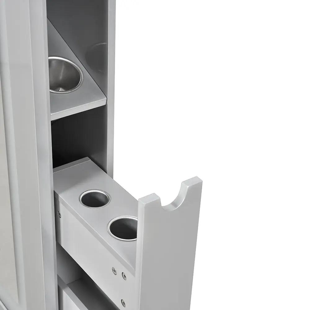 Um dos destaques do Monarch é o seu armário embutido. Essa estrutura elegante e brilhante não só adiciona um toque de sofisticação à decoração do seu salão, como também maximiza o aproveitamento de espaços pequenos. Com armários e gavetas com fechamento suave, você pode manter todos os seus itens essenciais de salão organizados e de fácil acesso. Chega de bancadas bagunçadas ou estações de trabalho desorganizadas!